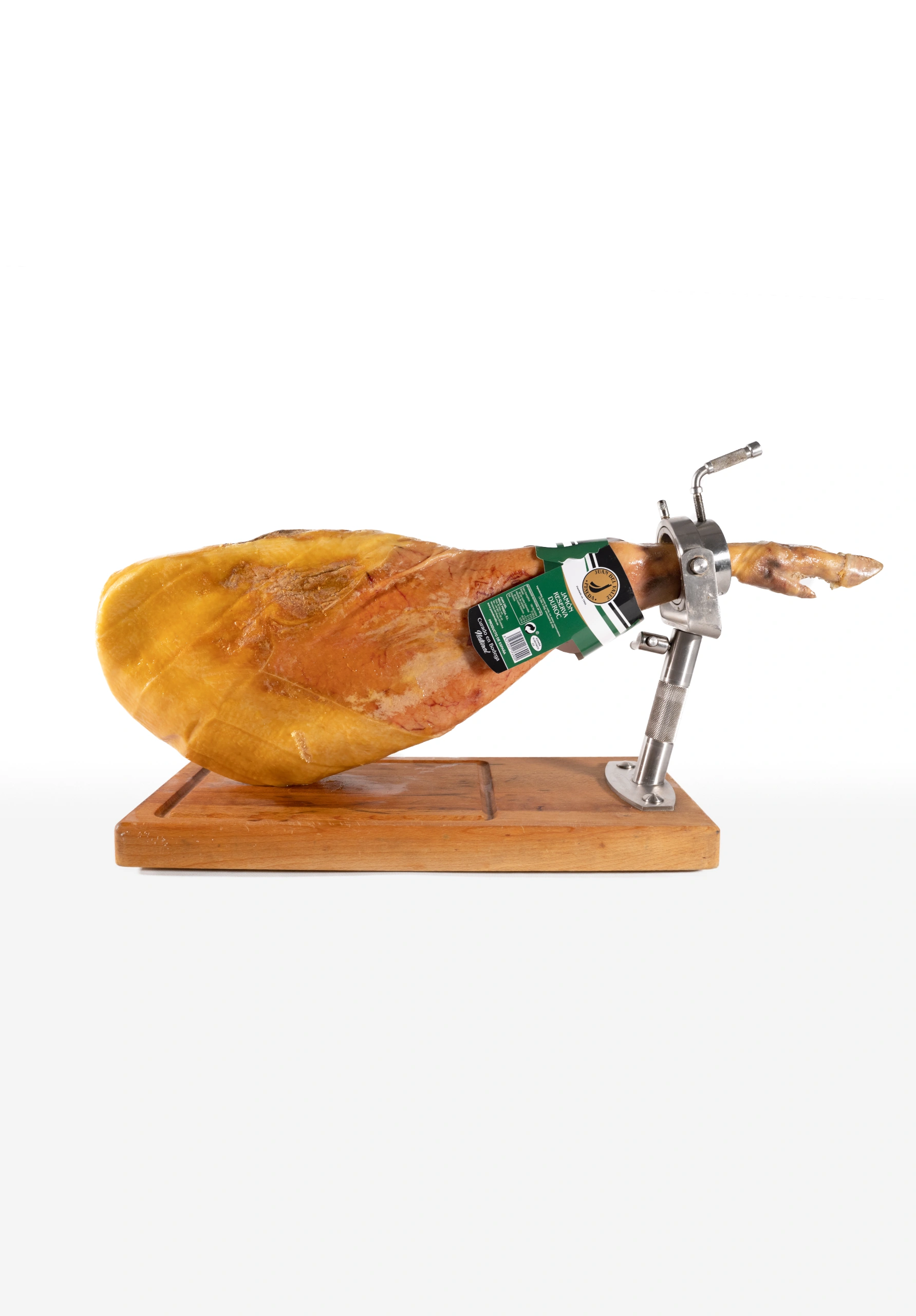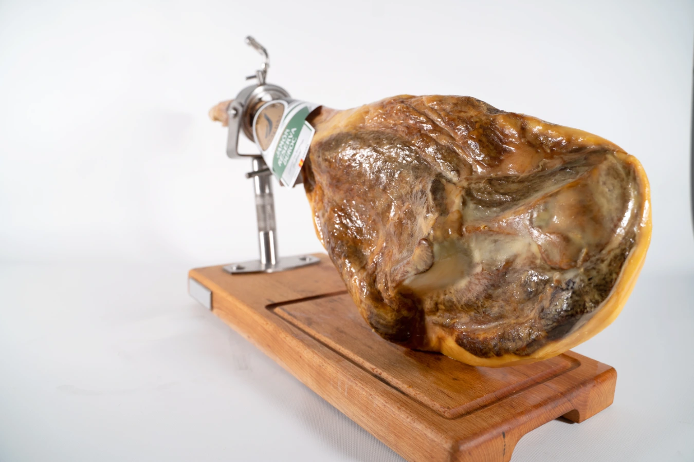 Un jamón graso, de textura fluida y jugosa, con un bajo contenido de sal, curado en bodega natural. Seleccionados de hembras o machos castrados.
